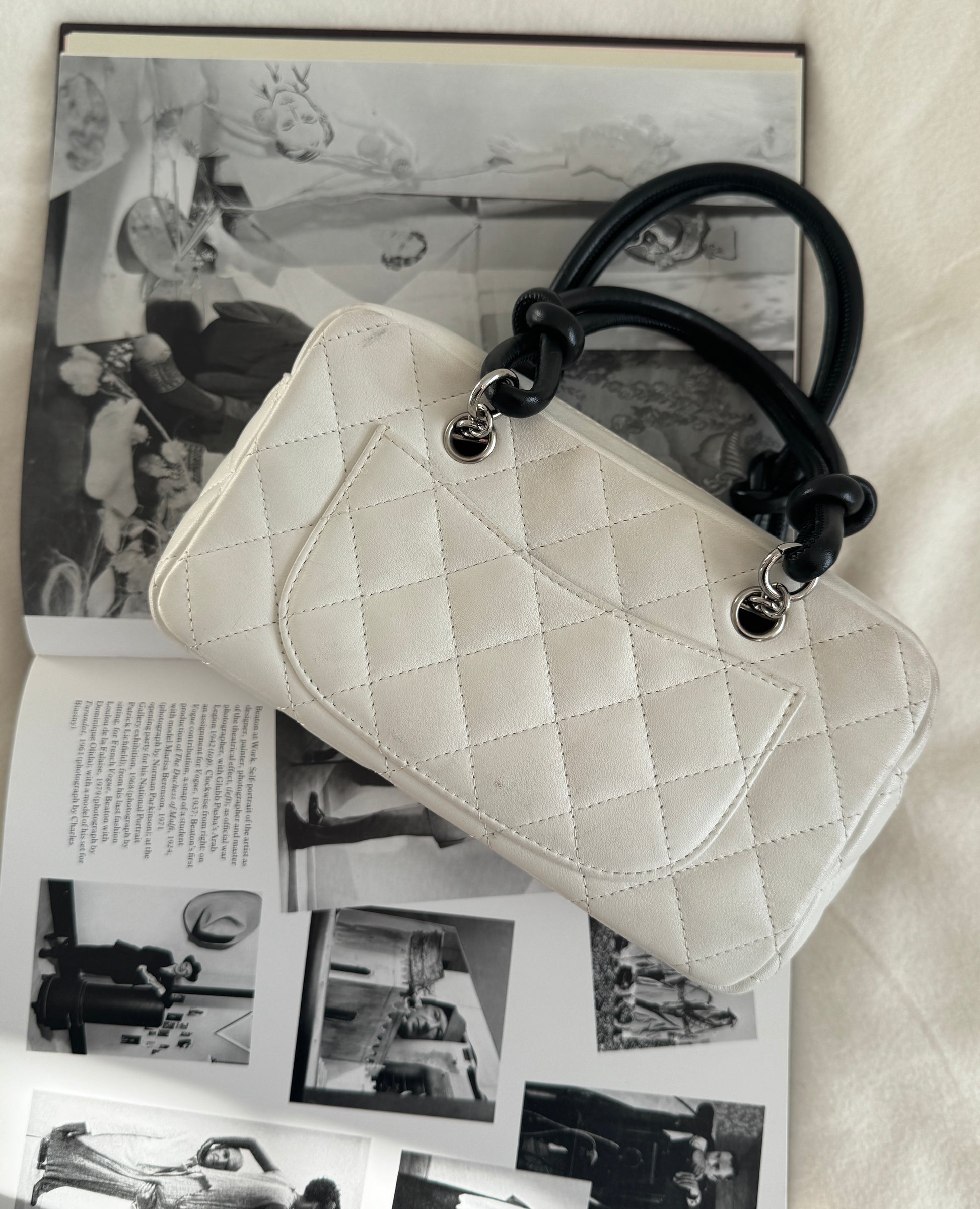 Vintage Chanel mini top-handle bag from the 2005–2006 Karl Lagerfeld era, crafted in white quilted leather with contrasting black accents. Features the iconic oversized CC logo, rolled leather handles, silver-tone hardware, and a zip-top closure. Finished with a logo jacquard interior, this compact bowler silhouette is a standout archival Chanel piece.