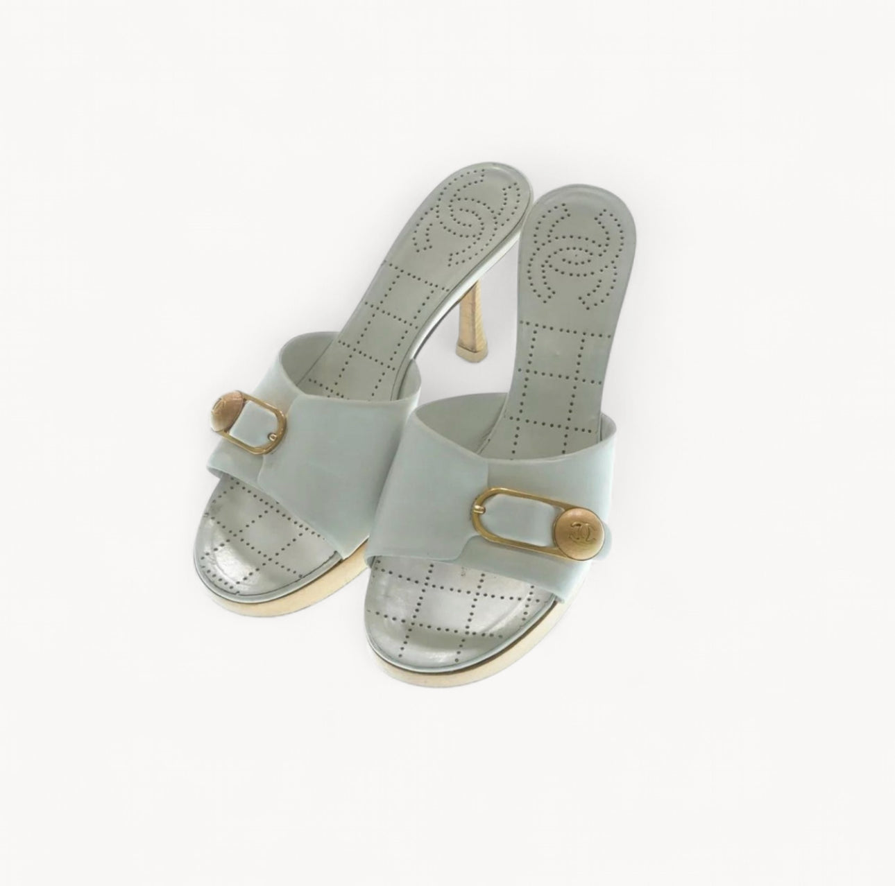 Early-2000s Chanel white heeled mules featuring a sculpted wooden heel and signature gold-tone hardware detail.