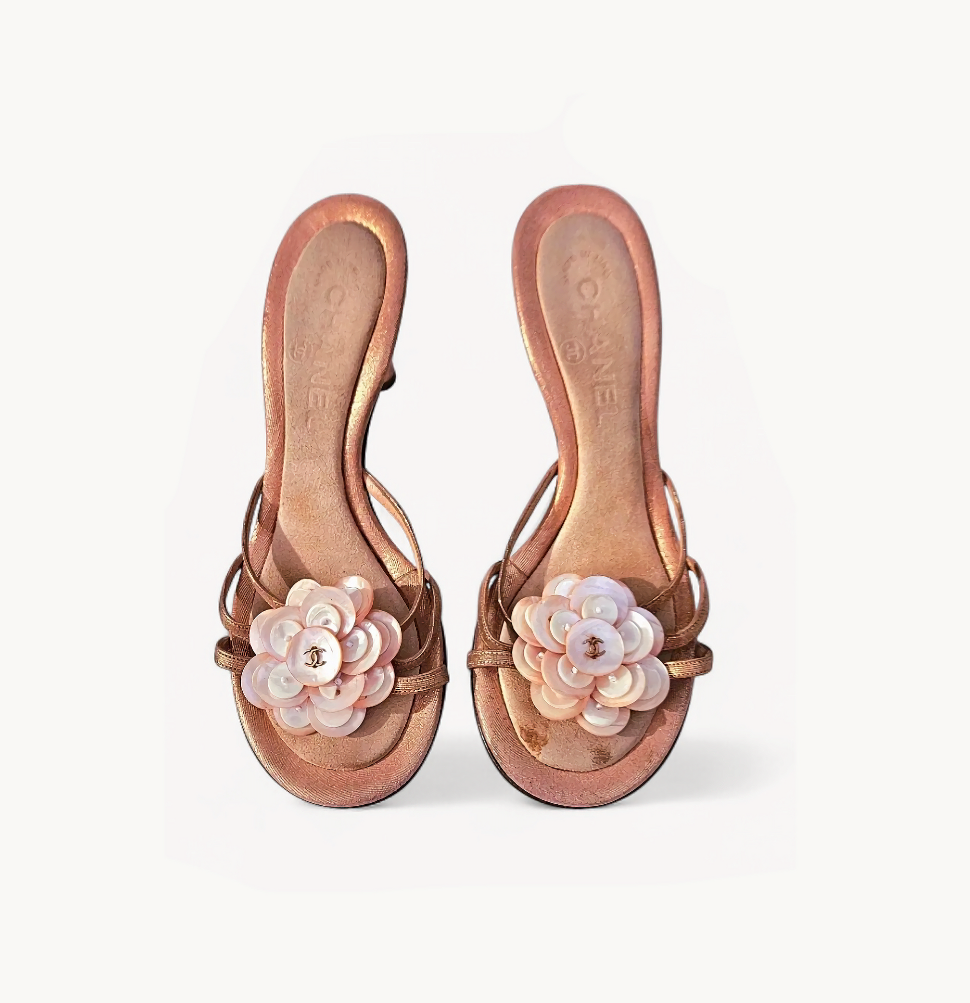 Vintage Rare Chanel 2000s peachy golden heels with iconic Camellia made out of shells and tiny CC logo.